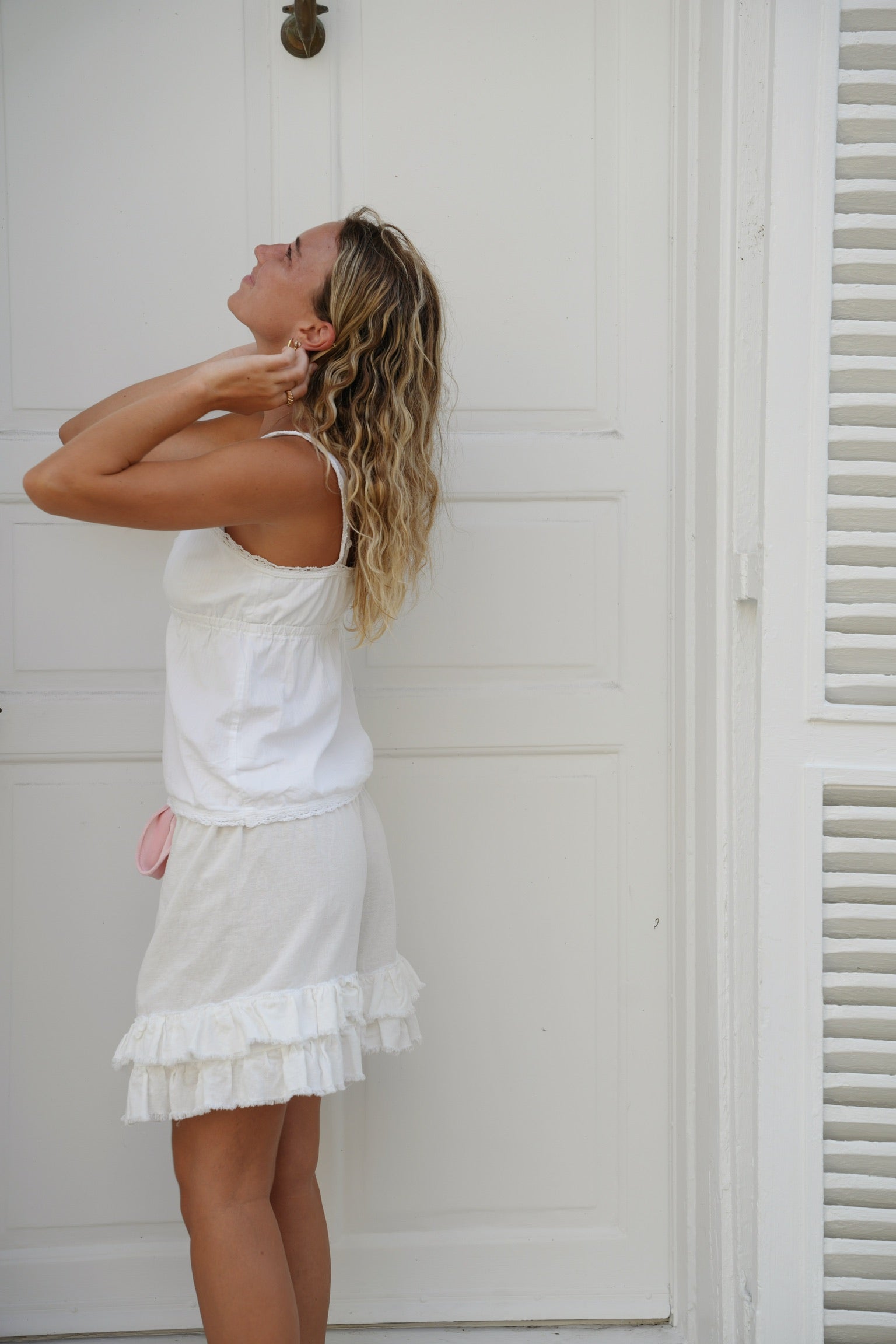 This piece features linen tones of white, soft pink velvet, and ruffle detailing. You can choose between a single or double ruffle. If you would like to add the embroidered pocket detailing shown in the first photo, please mention it in the notes section at checkout. If not specified, the pocket will not be added.
