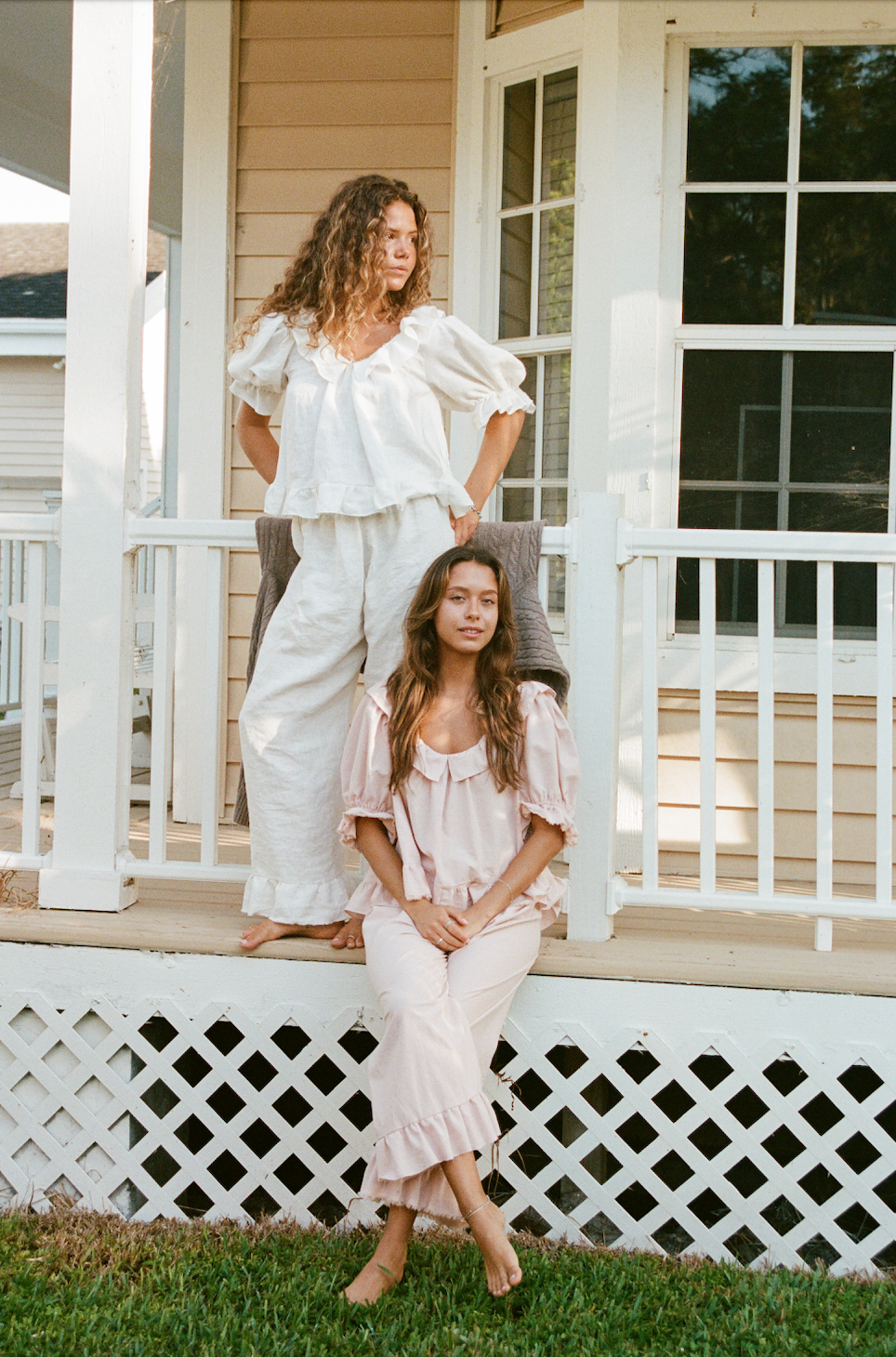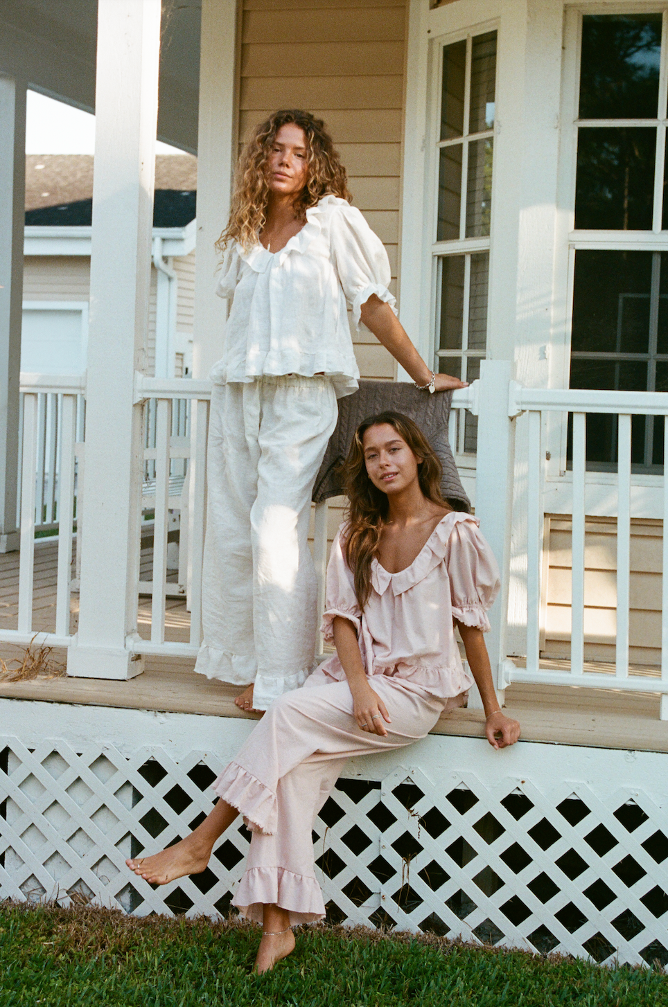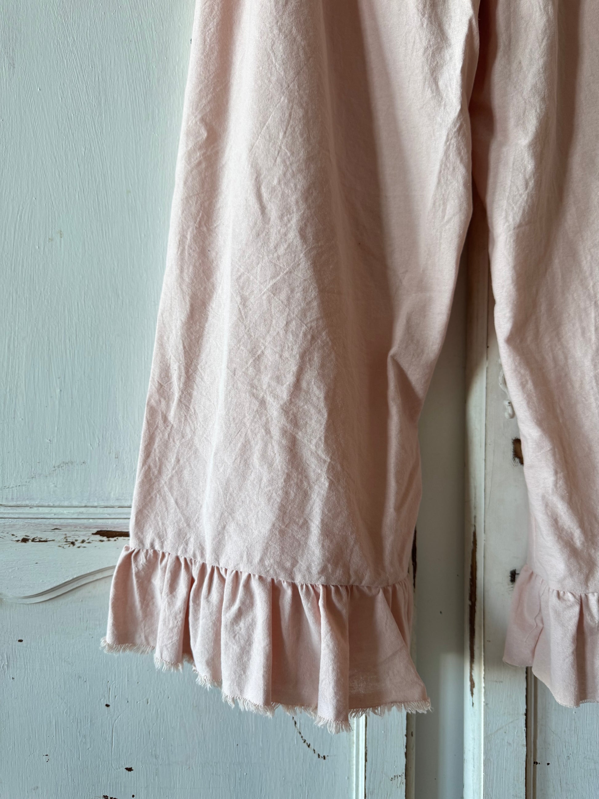 The Boheme Bloomers are a relaxed, free-flowing linen pant designed for everyday ease. Made in our 100% cotton in a muted pink, they feature a soft elastic waistband with a gentle ruffled finish and a wide ruffle hem at the ankle for a feminine touch. The fit is loose and comfortable, with your choice of inseam to create the length that feels best to you. Light, breathable, and effortless to wear throughout the seasons.