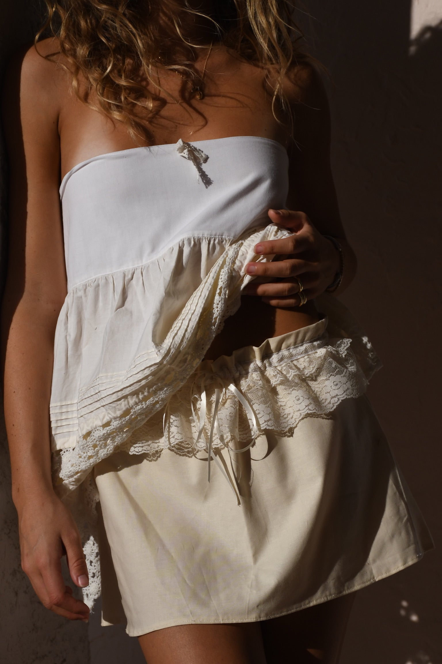 A fairytale piece designed for versatility as both a skirt and a top. The Chantilly Tulle is crafted from soft cream cotton muslin, adorned with delicate lace and ribbon details for a timeless, feminine touch.