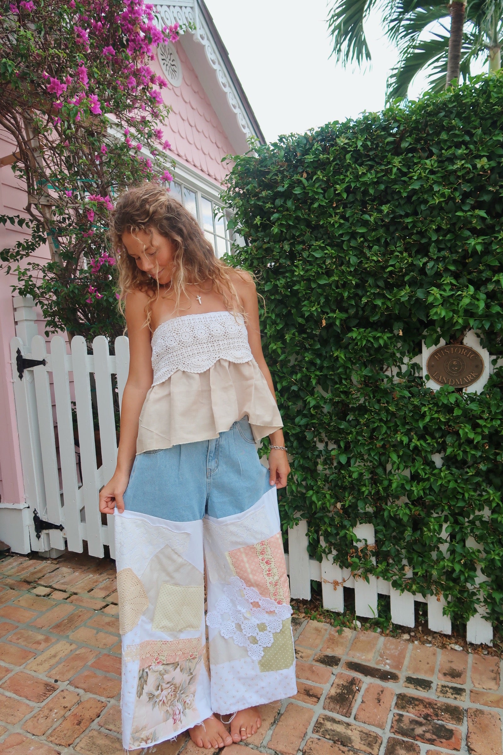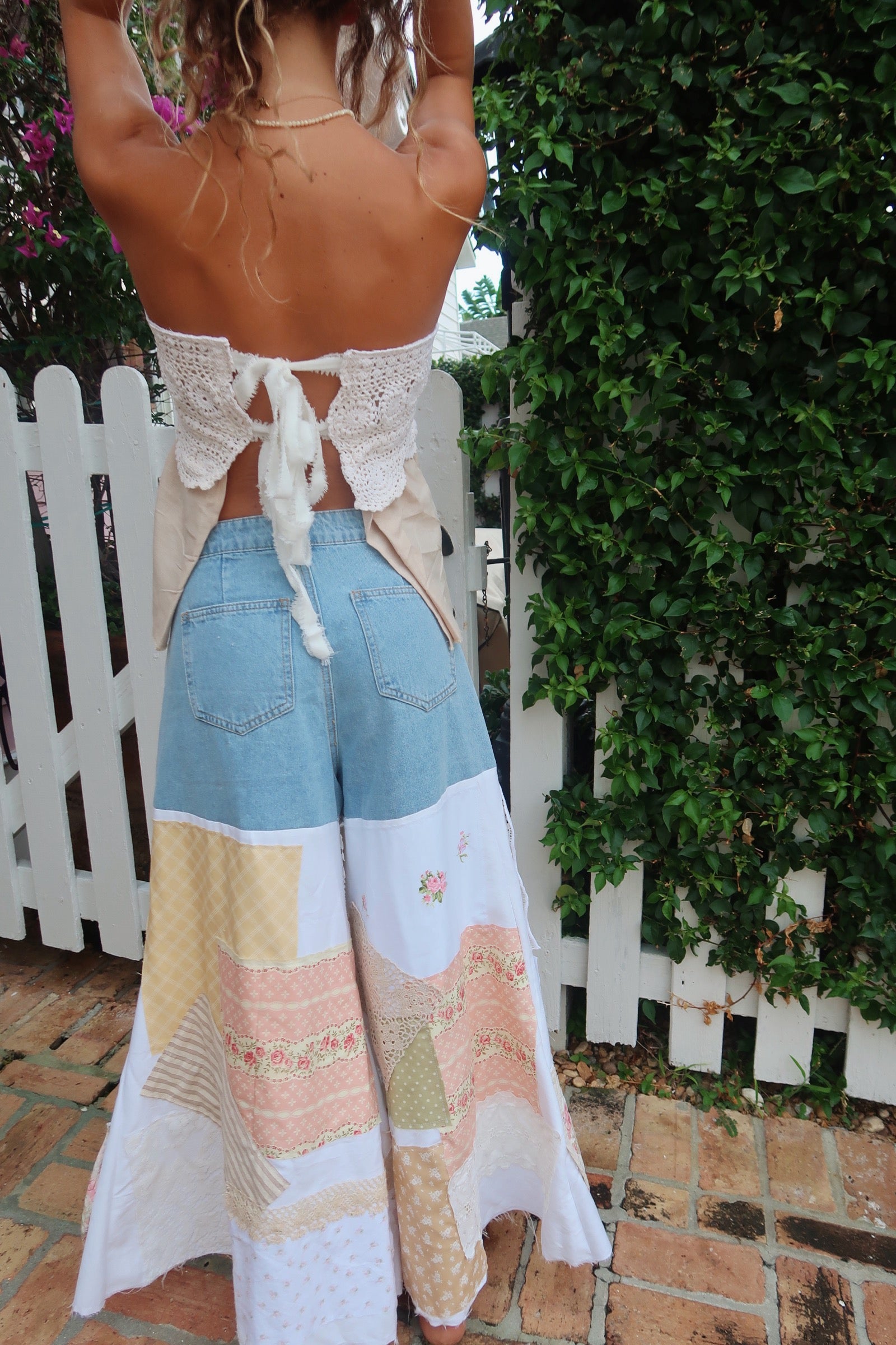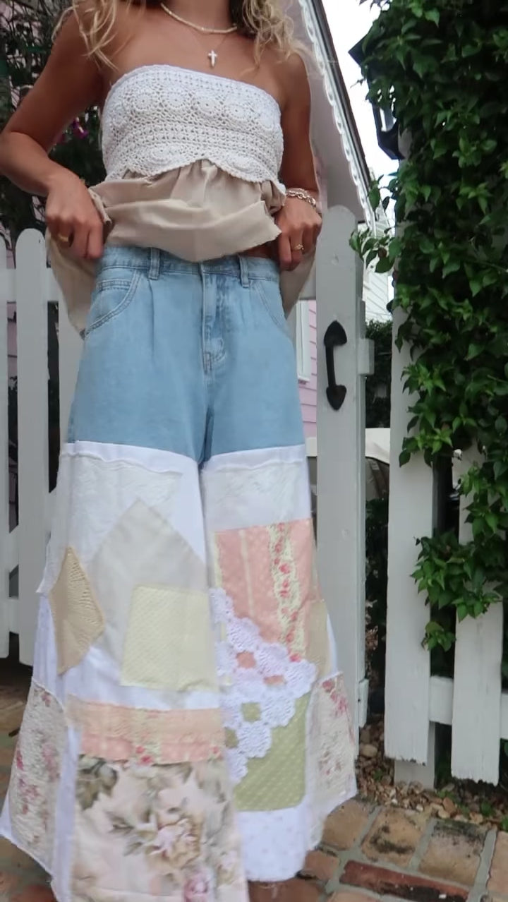 These unique patchwork denim pants, crafted from reworked, vintage fabrics like delicate crochets, laces, and quilts, add a vintage prairie charm to any outfit. Soft and flattering, they layer beautifully with various tops and are lightweight enough for both cooler and warmer weather.