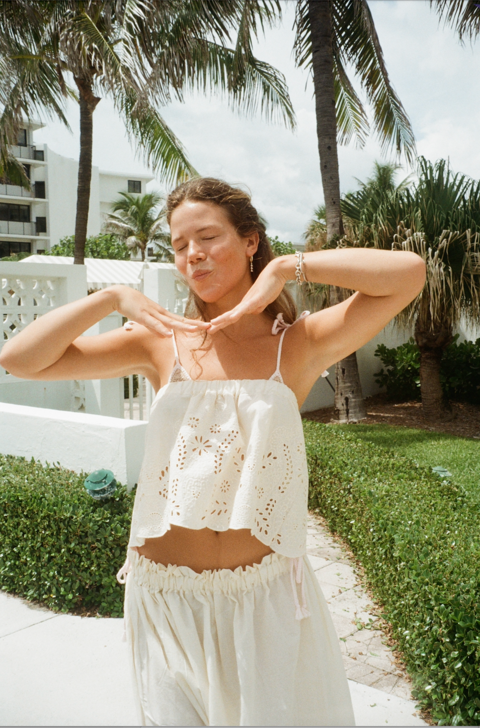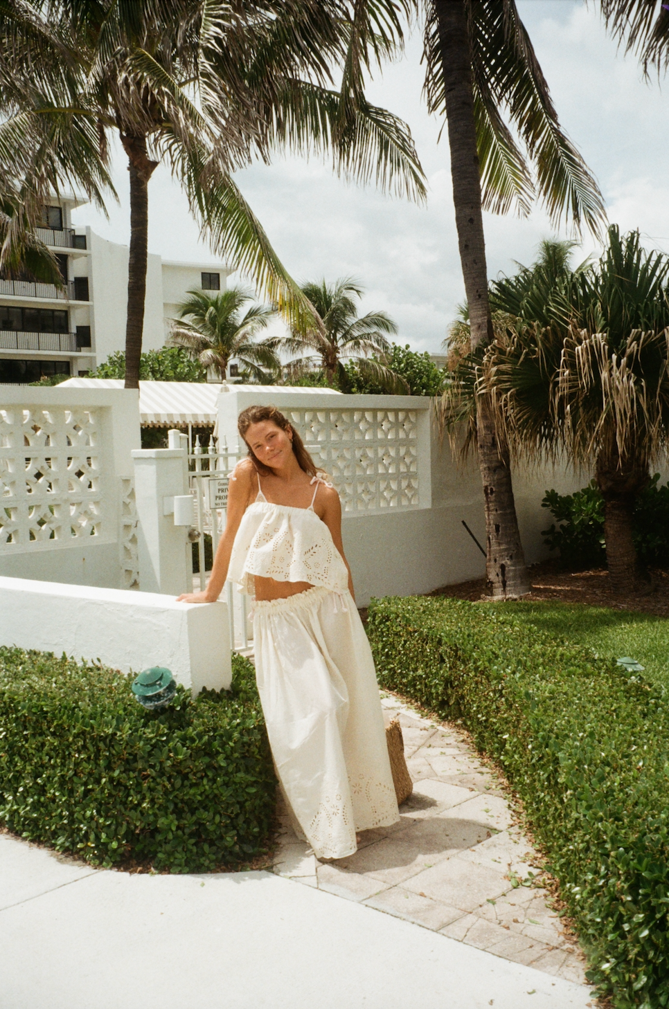 The Eyelet Cotton Set is a dreamy two-piece made from 100% eyelet cotton, in a beautiful creamy sand hue. The set includes a bandeau-style top with a gathered, adjustable neckline and a flowing maxi skirt with a flexible elastic waistband for comfort and ease of fit.