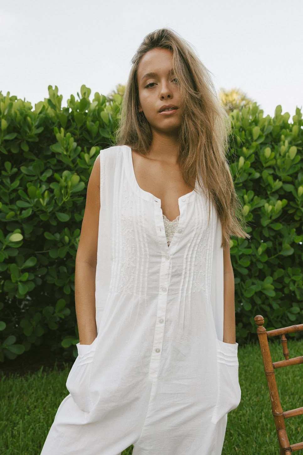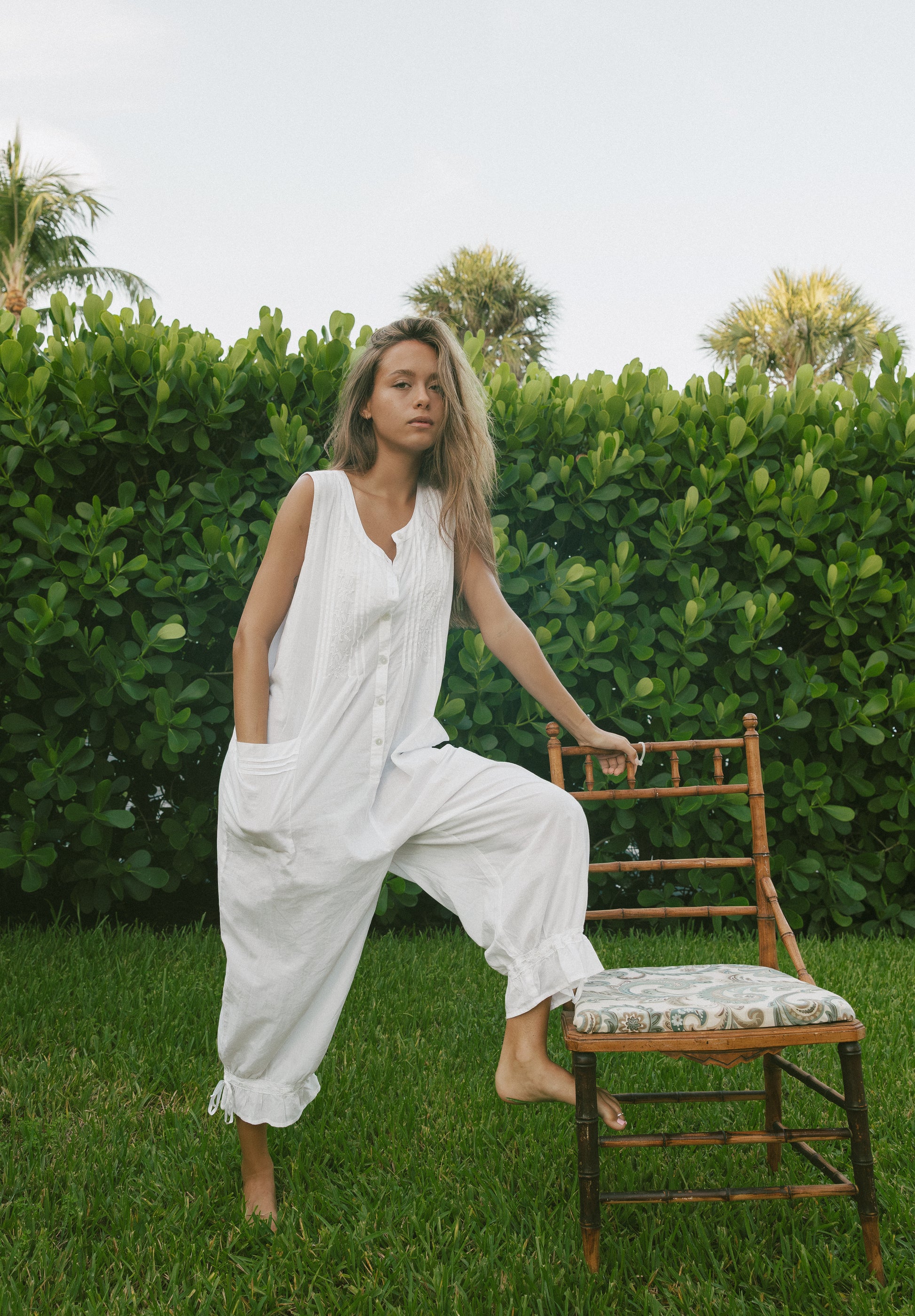 The Harbor Jumper in Ivory is crafted from 100% lightweight cotton for a breezy, effortless feel. Its relaxed, sleeveless silhouette features intricate lace accents, subtle embroidery, and a button-front bodice for easy wear. Side pockets and adjustable drawstring hems add a touch of function to its timeless charm. Designed for comfort and movement, this piece is made to be lived in from morning to night.