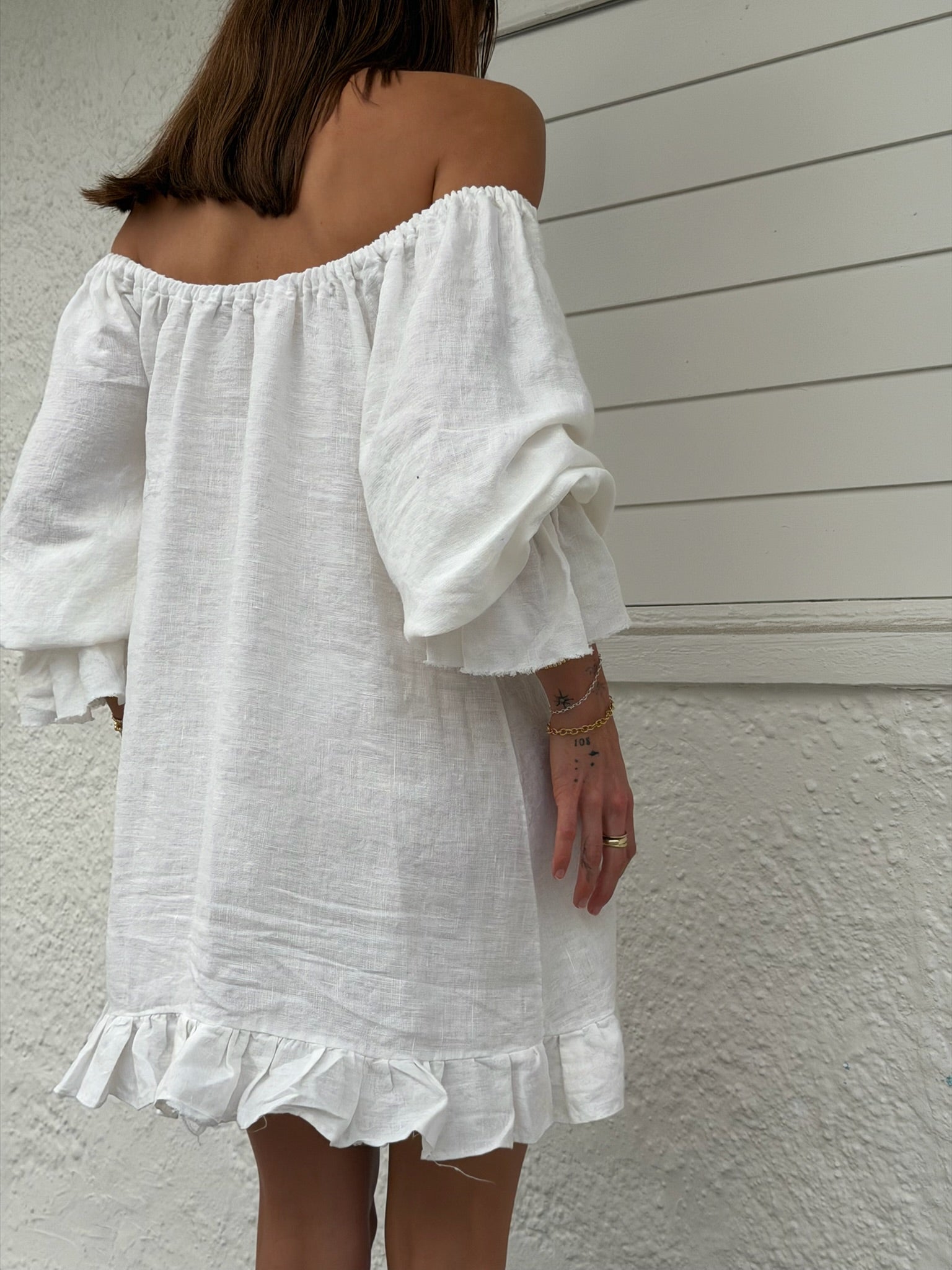 This handmade tunic dress is crafted from 100% pure European linen in our original ivory hue. Designed with an adjustable neckline for effortless on or off-the-shoulder styling, and finished with soft ruffle detailing for a romantic silhouette. Model is 5'8" wearing the standard length size S/M.