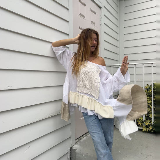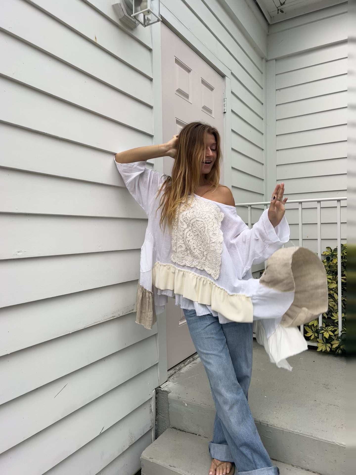 Handmade from a mix of neutral tones, vintage cottons, upcycled fabric scraps, and crochet pieces. Designed to be be oversized with a freeing feel!