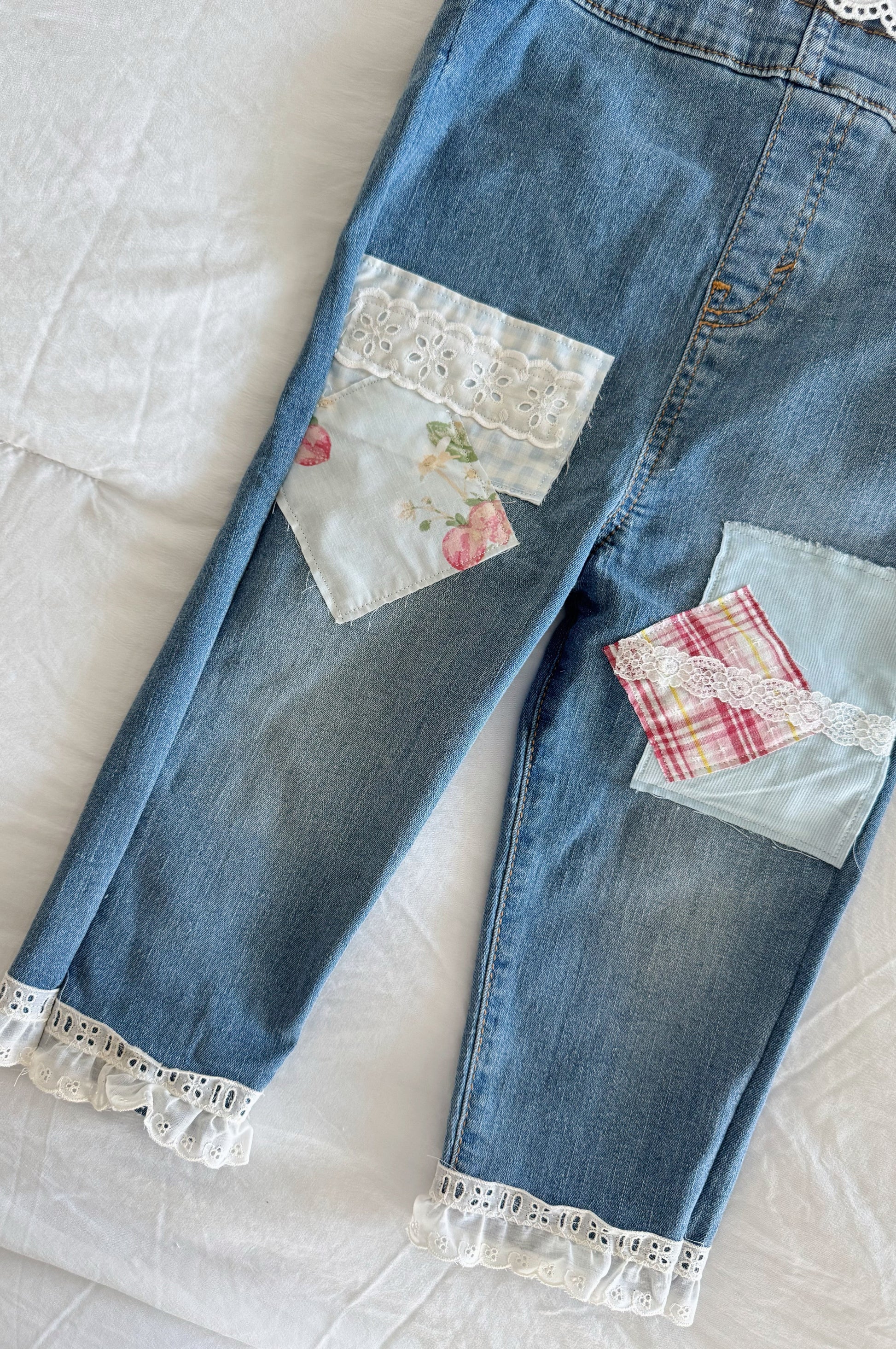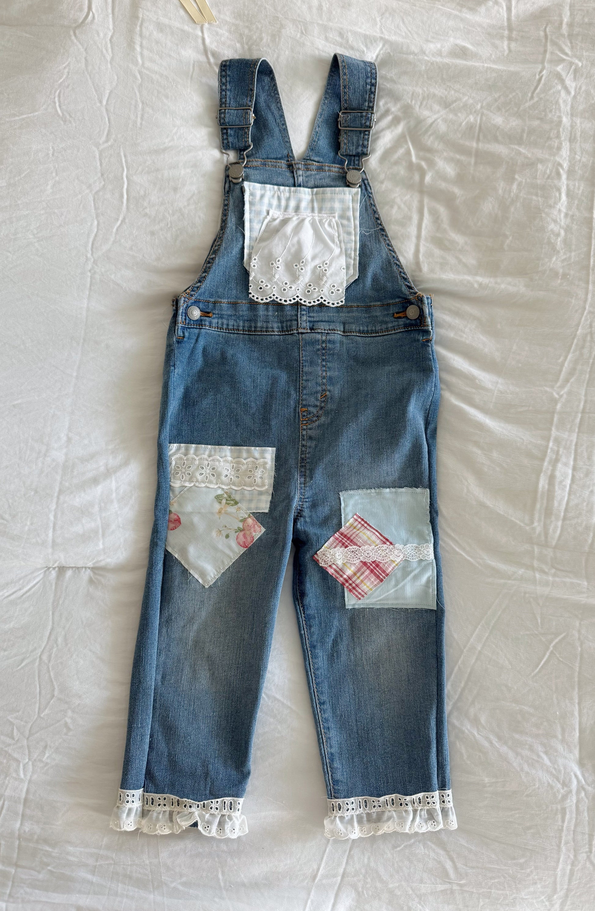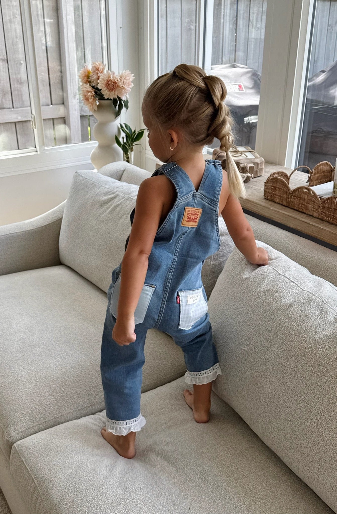 Upcycled from vintage Levi’s for the littles! Each pair is reworked with gingham patches, soft eyelet lace, and delicate touches of pink. A patchwork staple made with love, available in sizes 6 months to 4T.