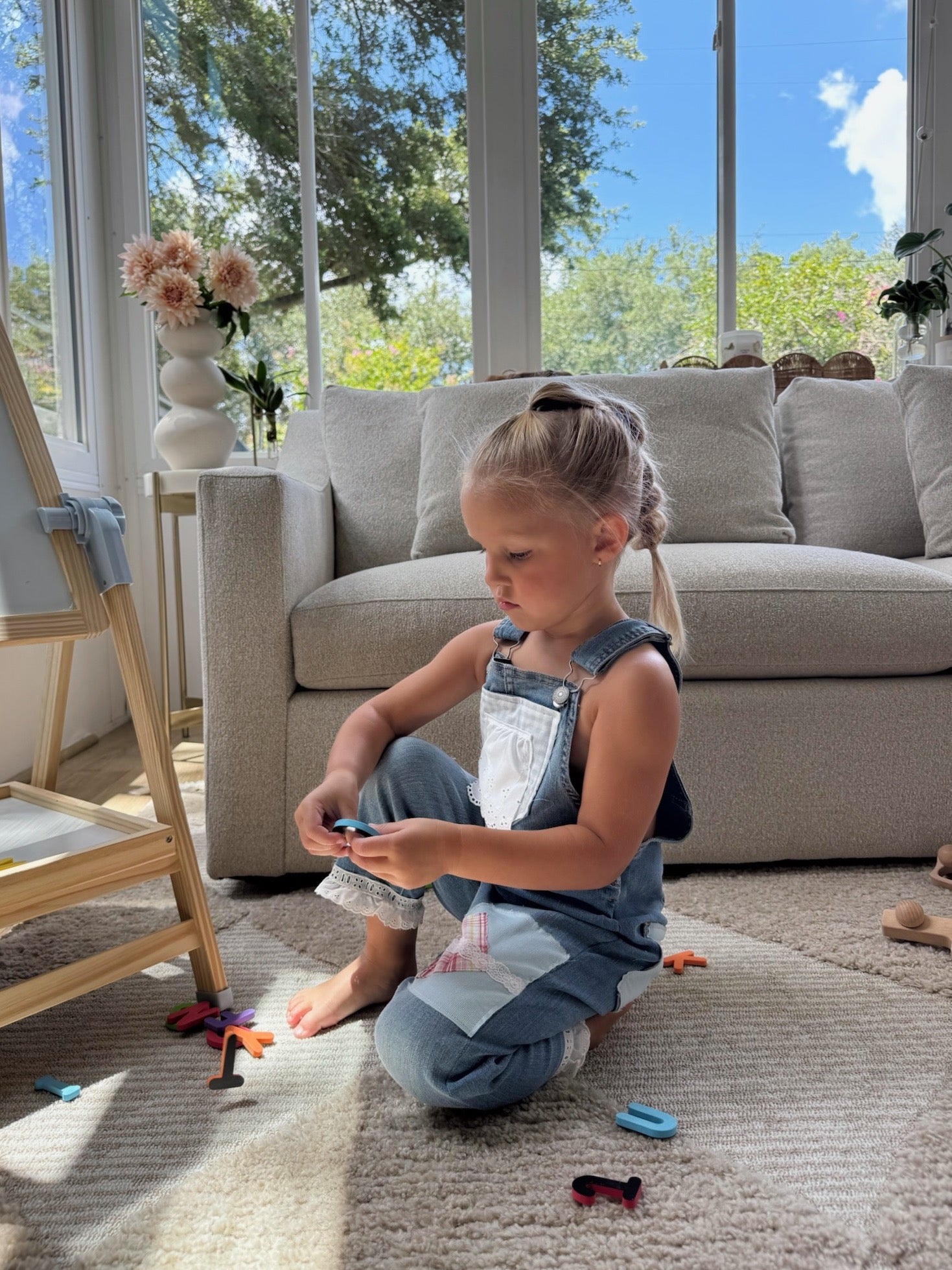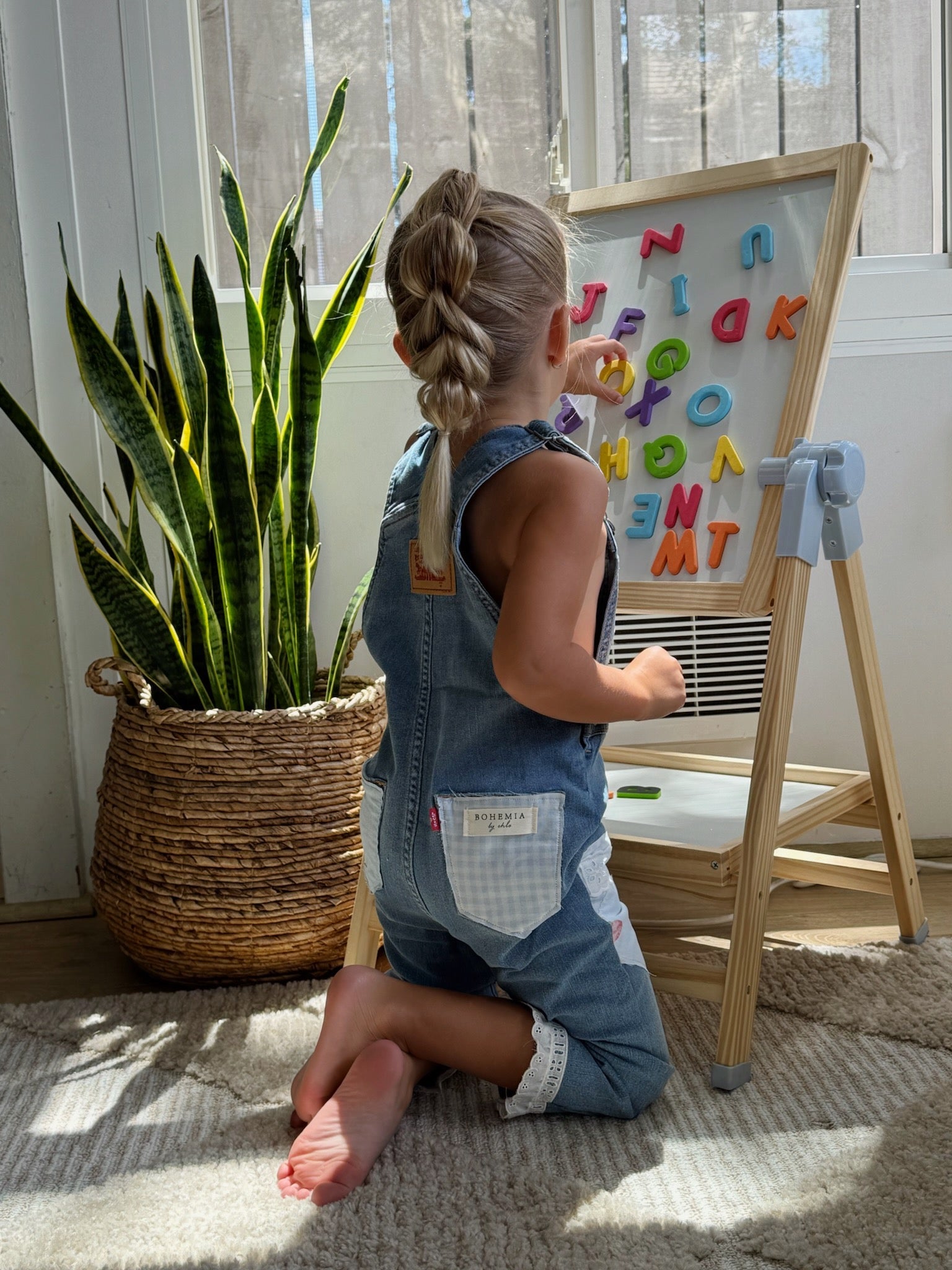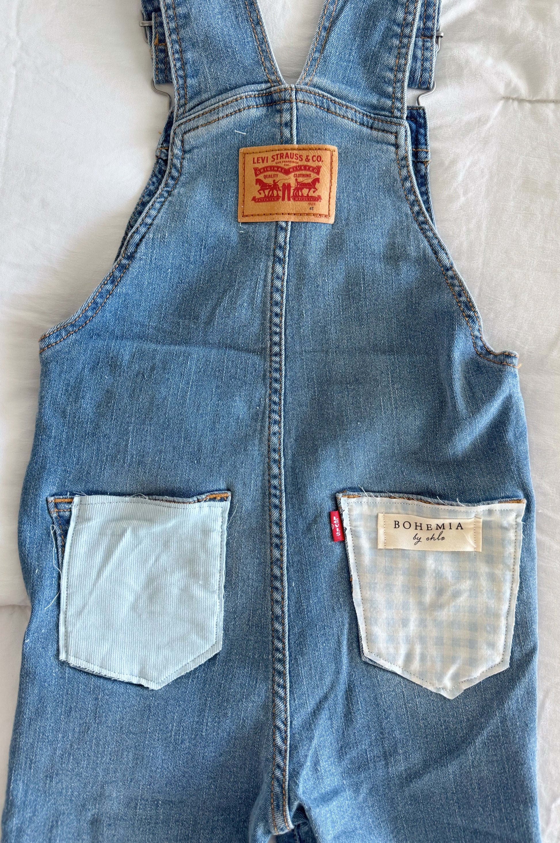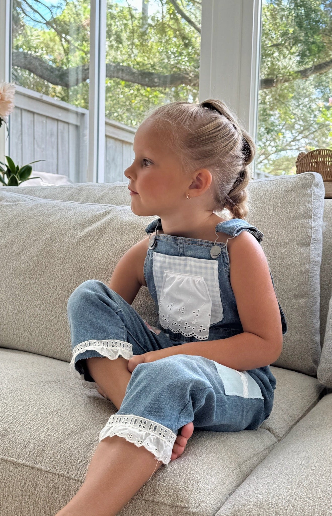 Upcycled from vintage Levi’s for the littles! Each pair is reworked with gingham patches, soft eyelet lace, and delicate touches of pink. A patchwork staple made with love, available in sizes 6 months to 4T.