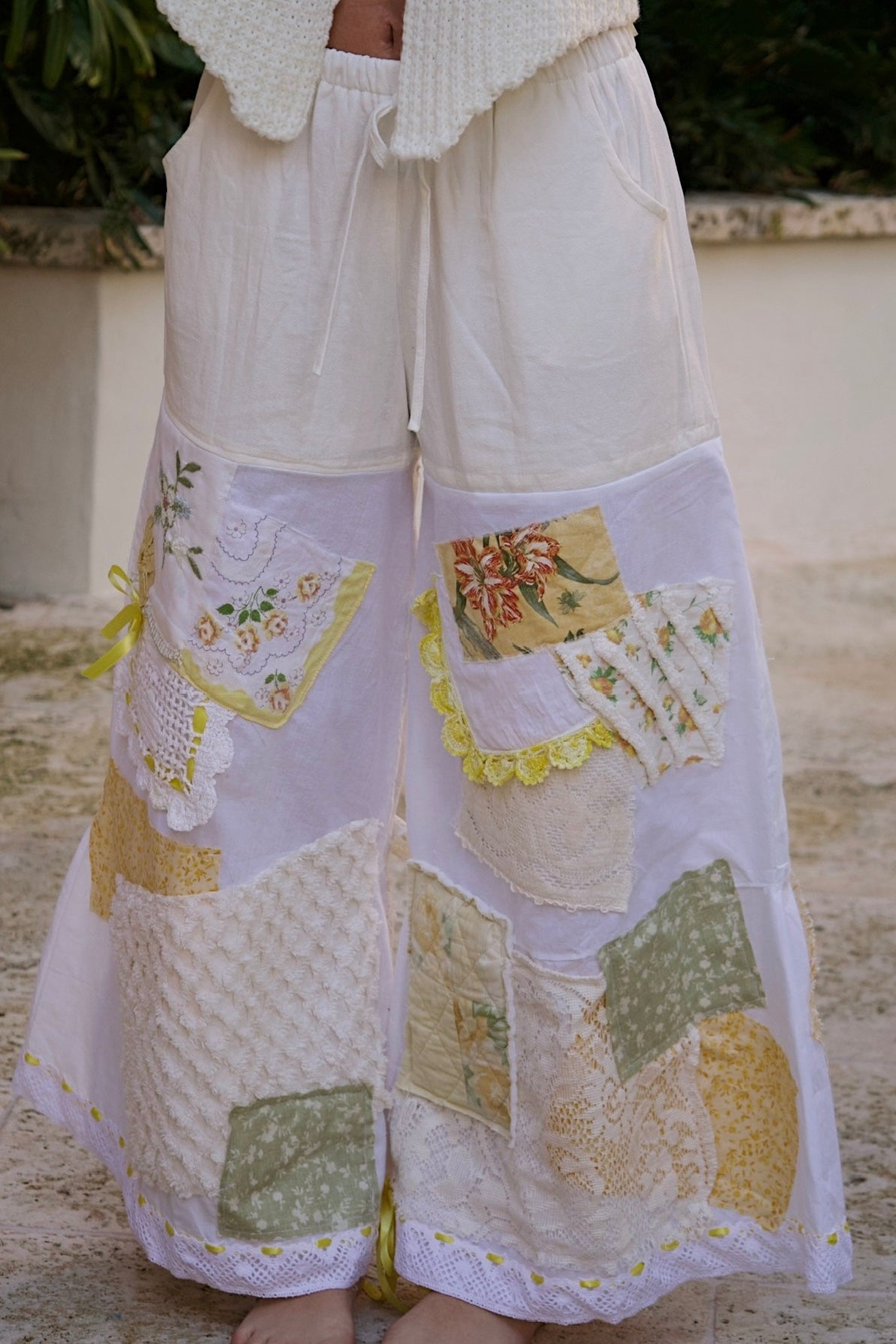 One-of-a-kind patchwork pants sourced from vintage fabrics around the world, crafted using a mix of crochets, laces, quilts, and vintage materials to channel your inner Bohemian style!