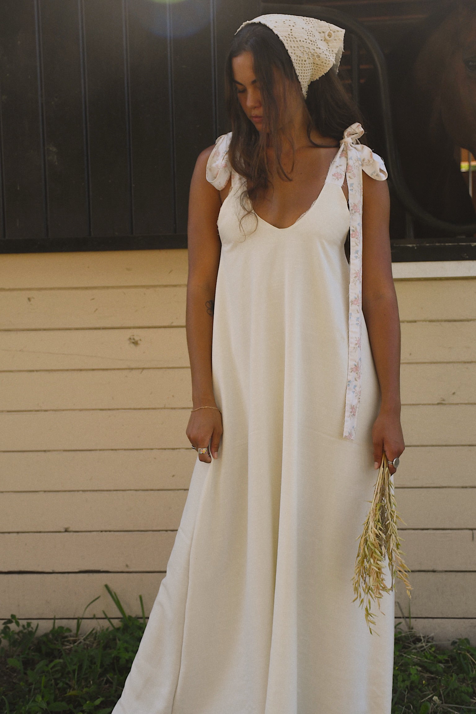 Crafted from a breathable linen-rayon fabric in a soft cream hue, it’s perfect for capturing countryside serenity. Adjustable shoulder ties, repurposed from vintage floral bedding, add a touch of timeless whimsy. The full-length design features a flattering V-cut front and back, available in three customizable lengths—short (38") long (45") extra long (48") from armpit to hem. For additional sizing requests, simply leave a note at checkout.