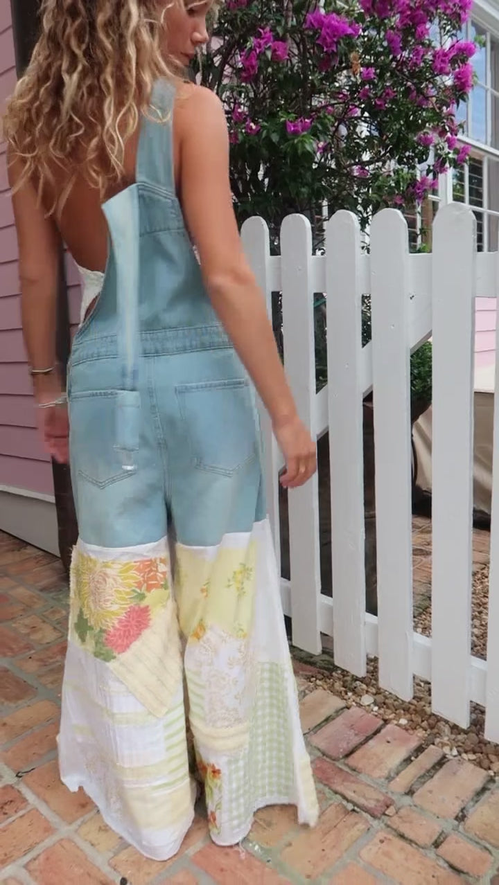 These one-of-a-kind patchwork overalls, made from reworked vintage fabrics like delicate crochets, laces, and quilts, bring a touch of vintage prairie charm to any outfit. Featuring adjustable straps and a relaxed fit, they offer comfort in a stunning blend of denim blues, soft yellows, and floral patterns.
