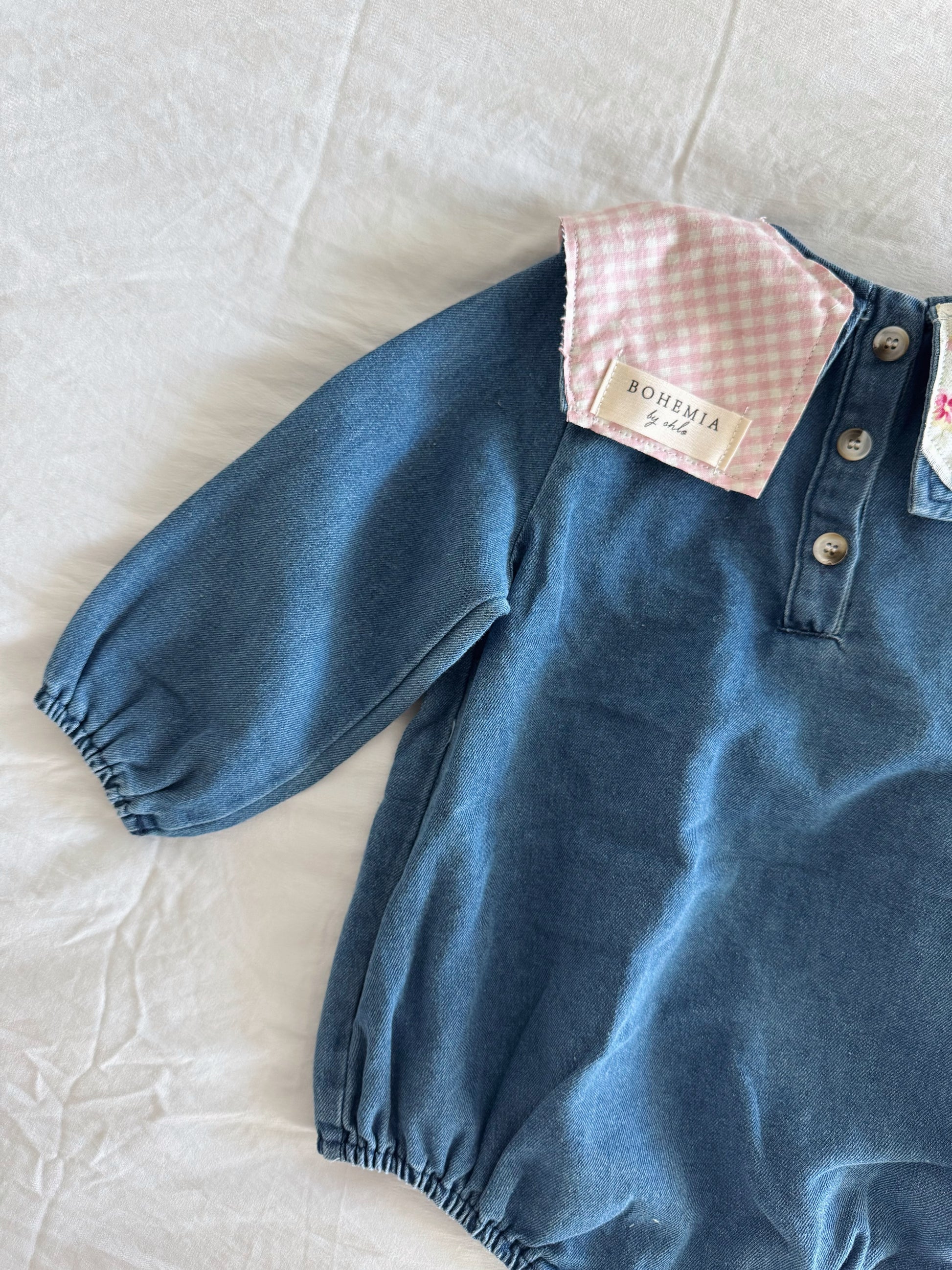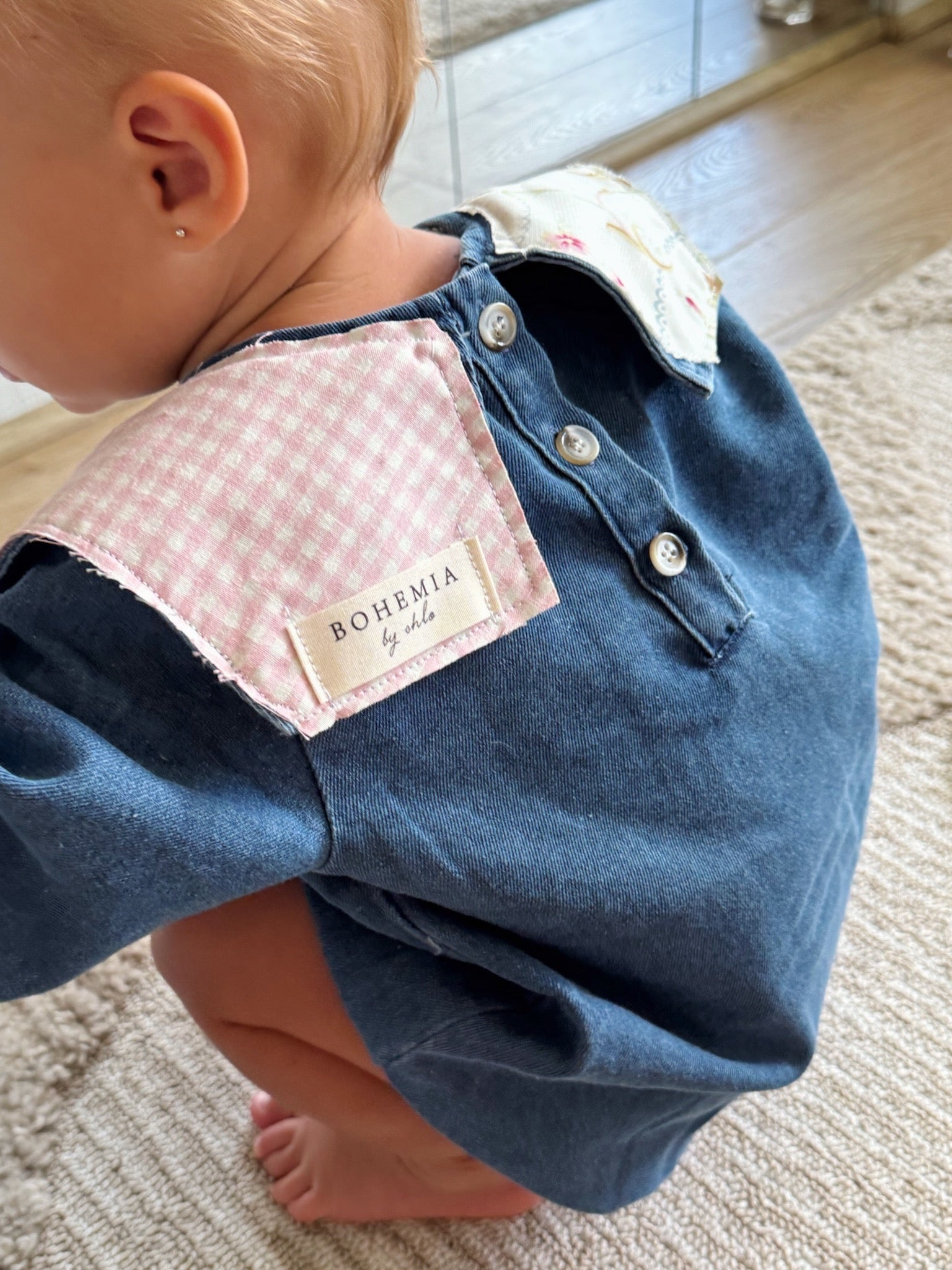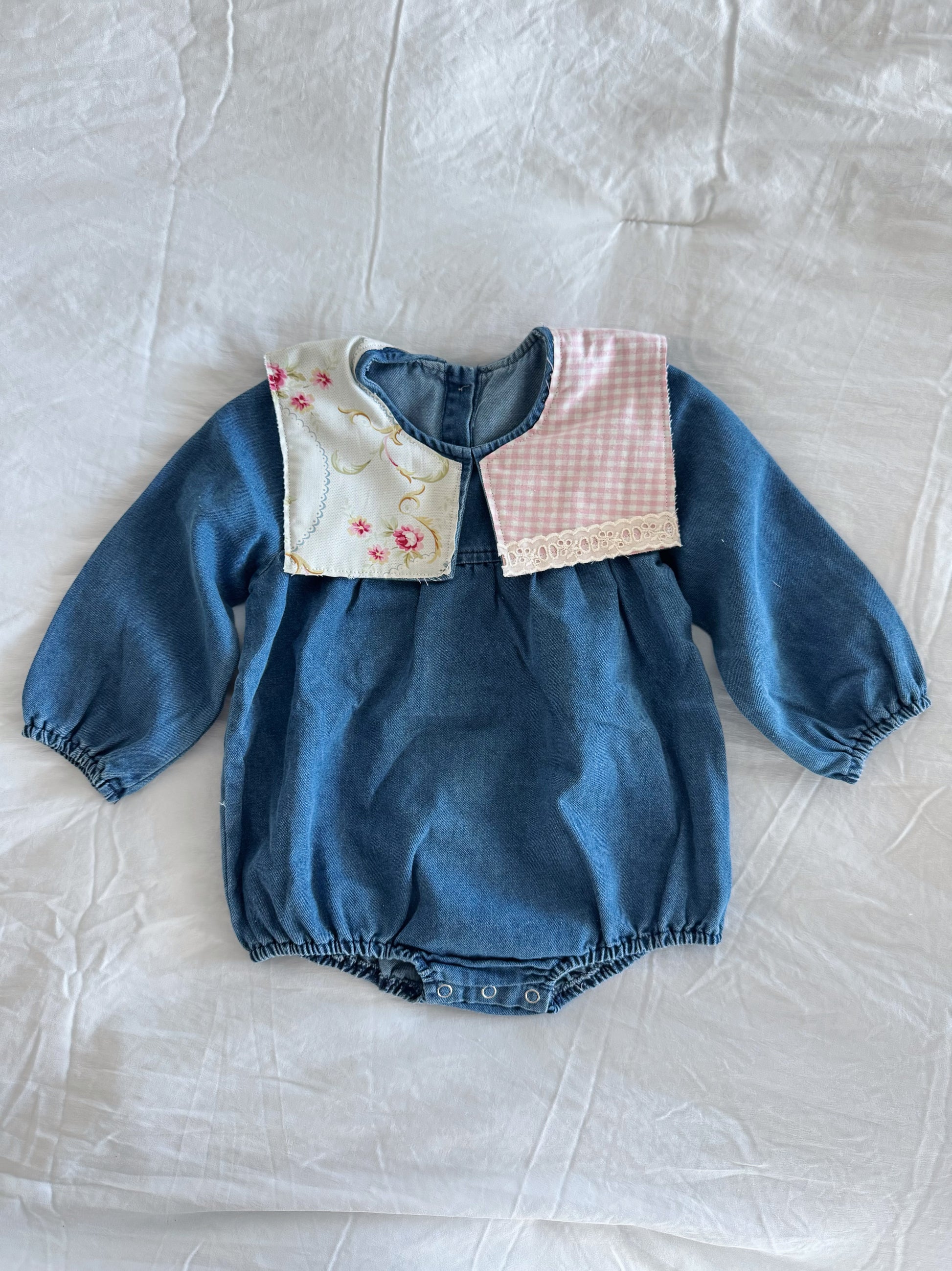 A sweet denim one-piece made for the littlest ones! Thoughtfully upcycled with gingham and floral patchwork, finished with delicate eyelet details. Offered in sizes 3 to 24 months. Each piece is made with love and full of charm.