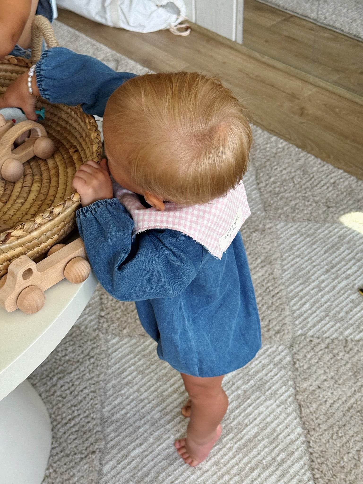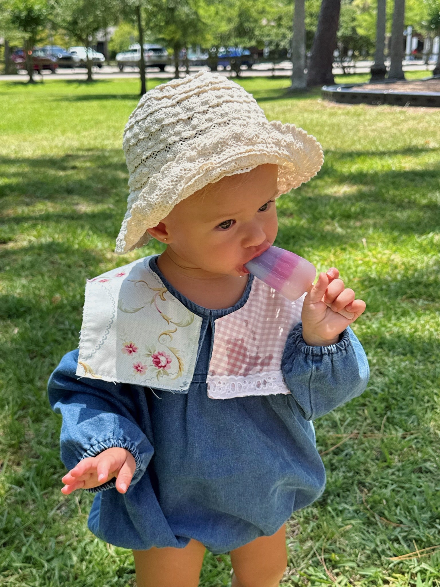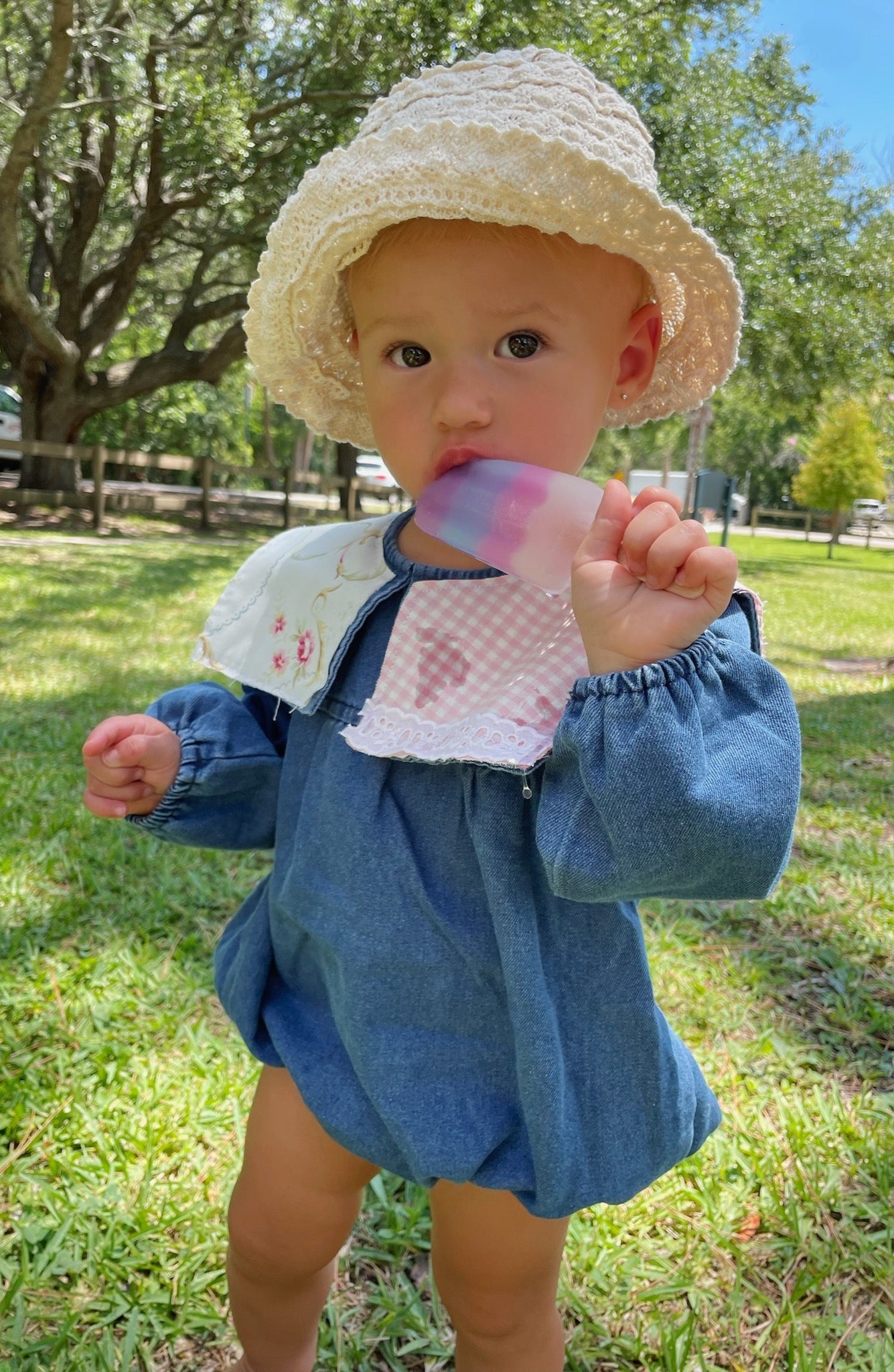 A sweet denim one-piece made for the littlest ones! Thoughtfully upcycled with gingham and floral patchwork, finished with delicate eyelet details. Offered in sizes 3 to 24 months. Each piece is made with love and full of charm.