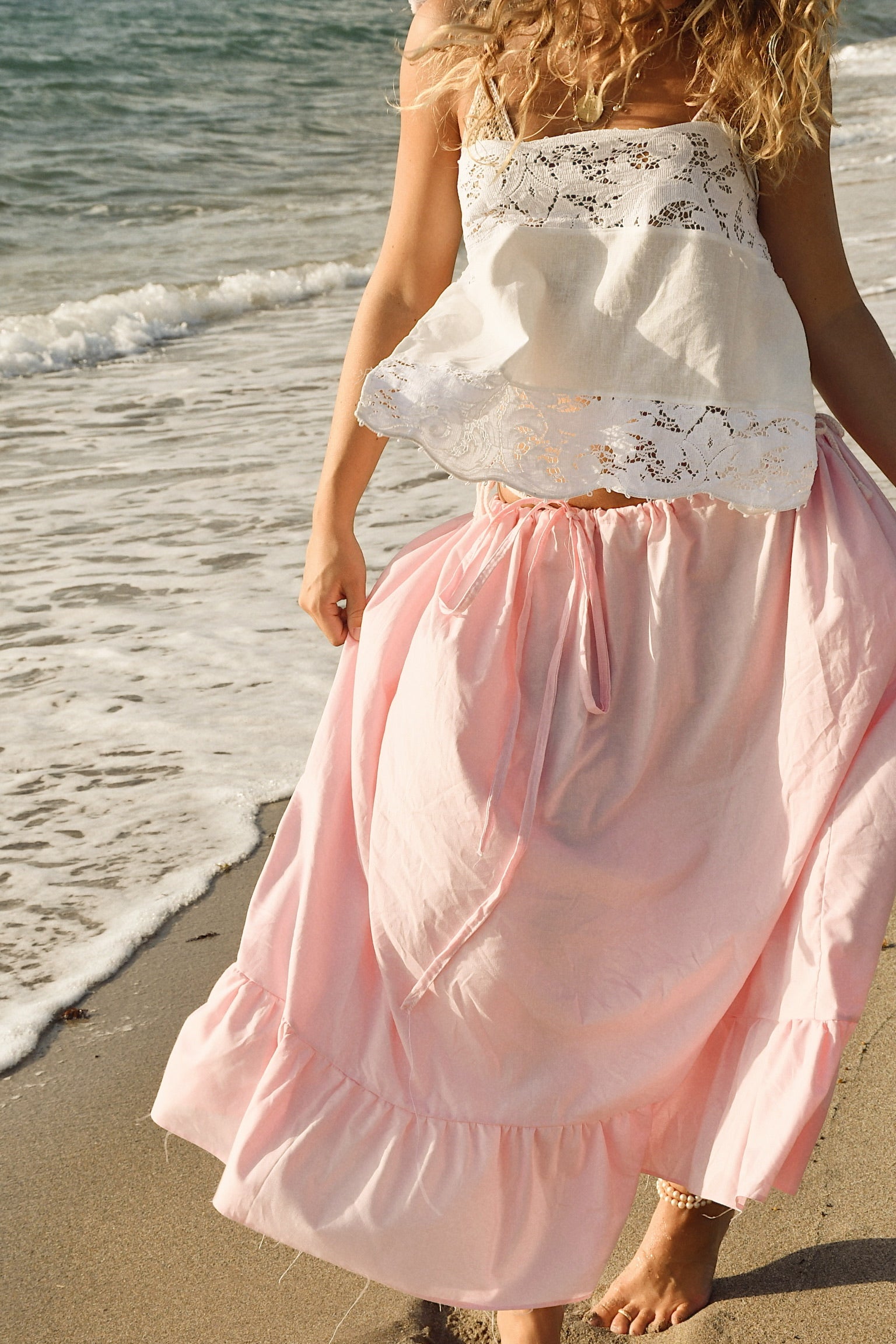 Soft, airy, and effortlessly flattering—the Pink Soufflé Maxi is crafted from 100% cotton in a delicate blush hue. Designed with a gathered waistband that expands generously or cinches all the way down to an xxs, this piece adapts to your shape and style with ease.