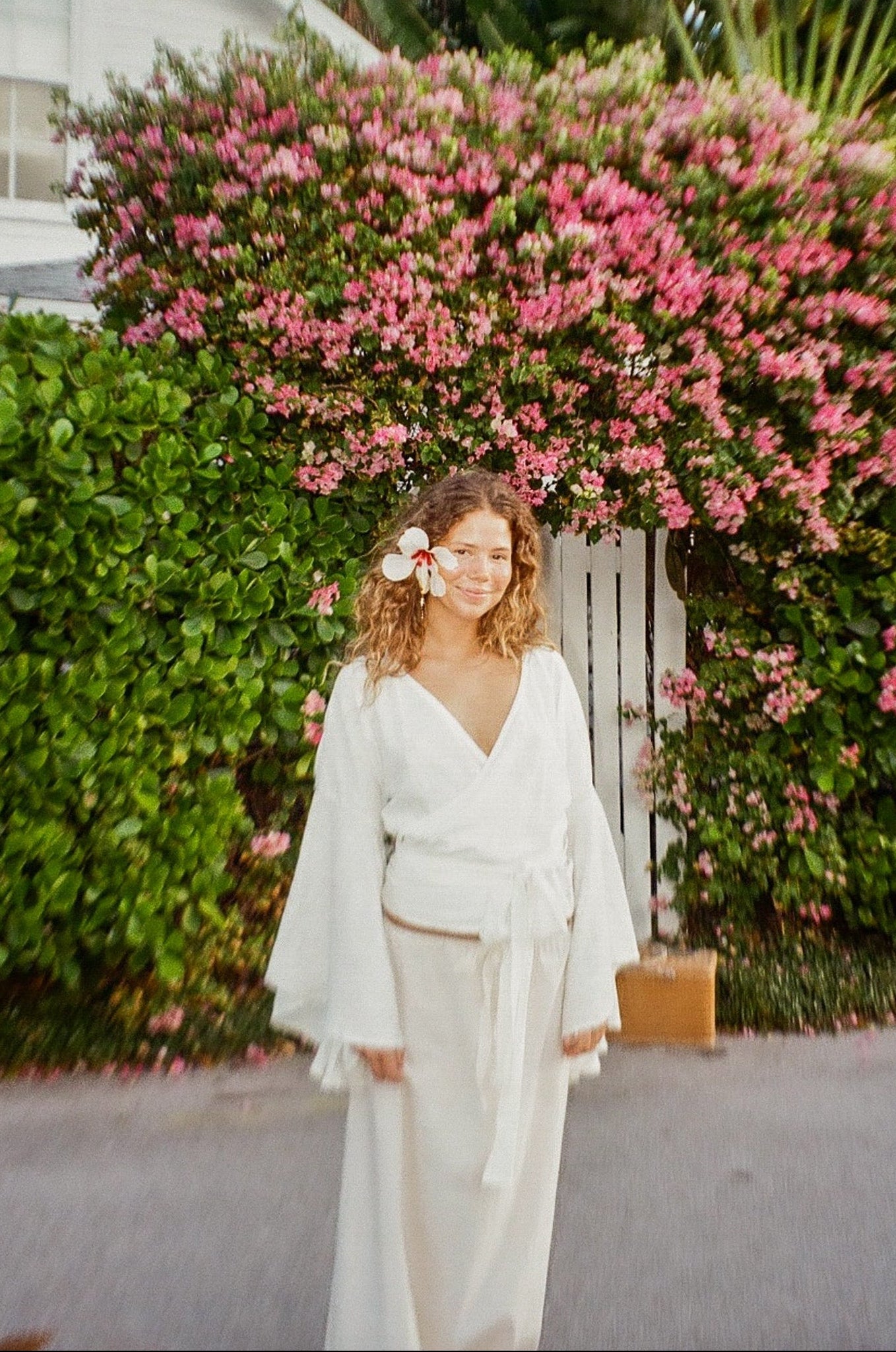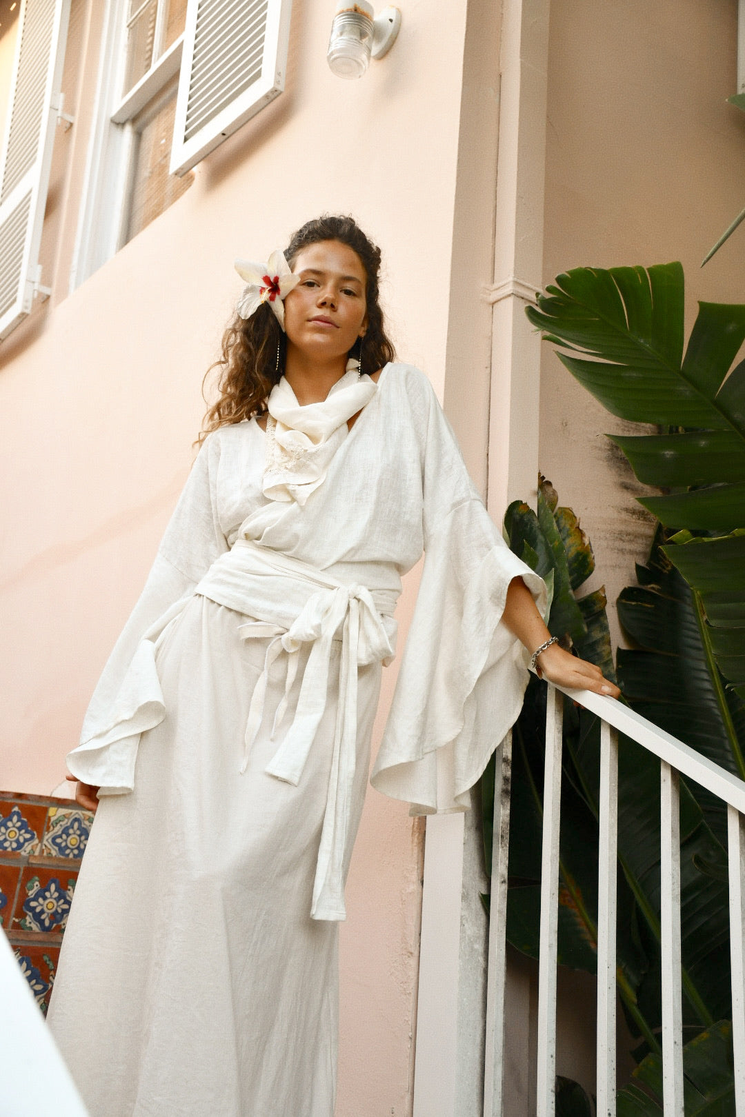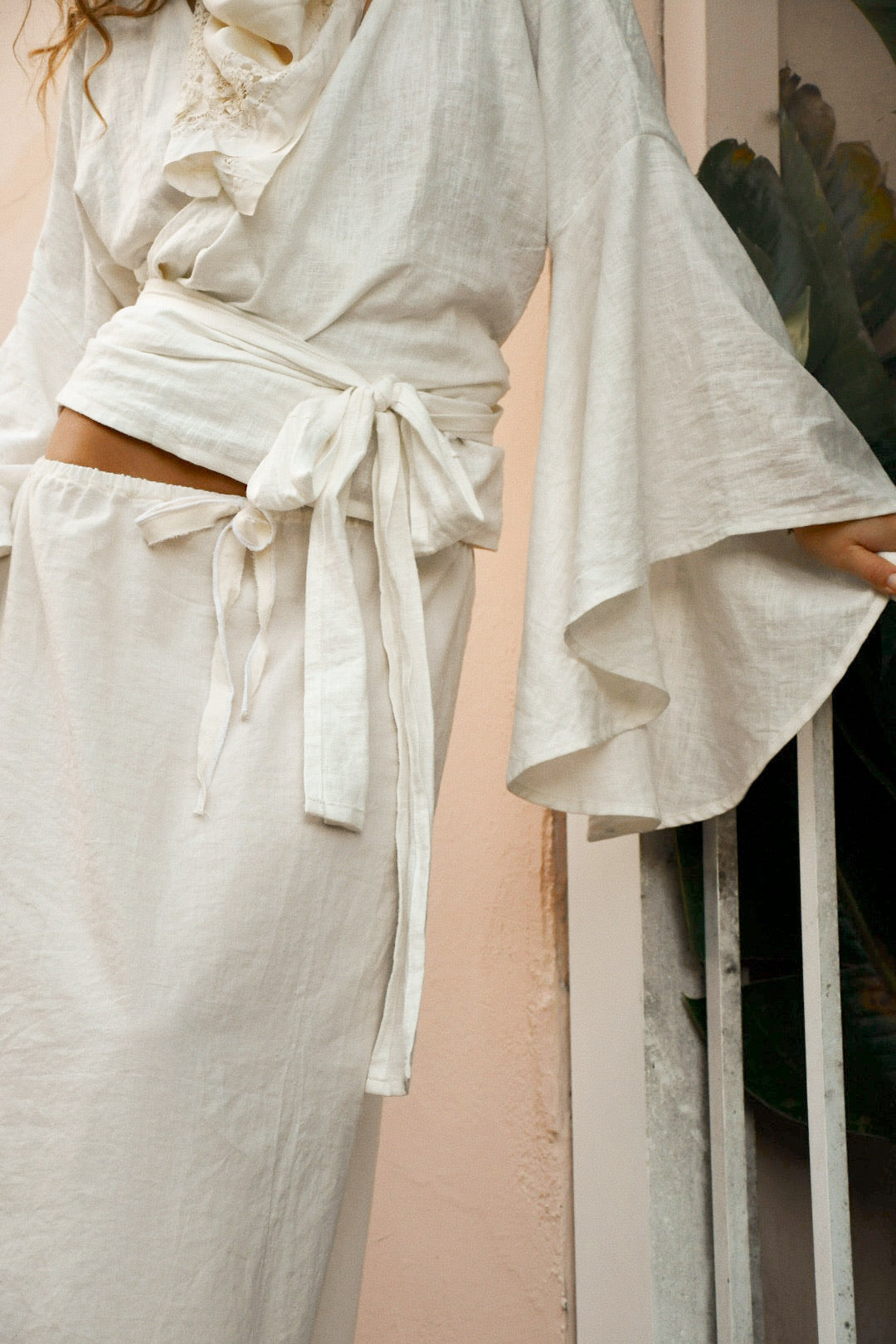Crafted from pure Ivory linen, this piece features an adjustable wrap silhouette that allows for a variety of ways to wear. The flowy sleeves drape beautifully adding a romantic touch to an otherwise relaxed and easy fit.
