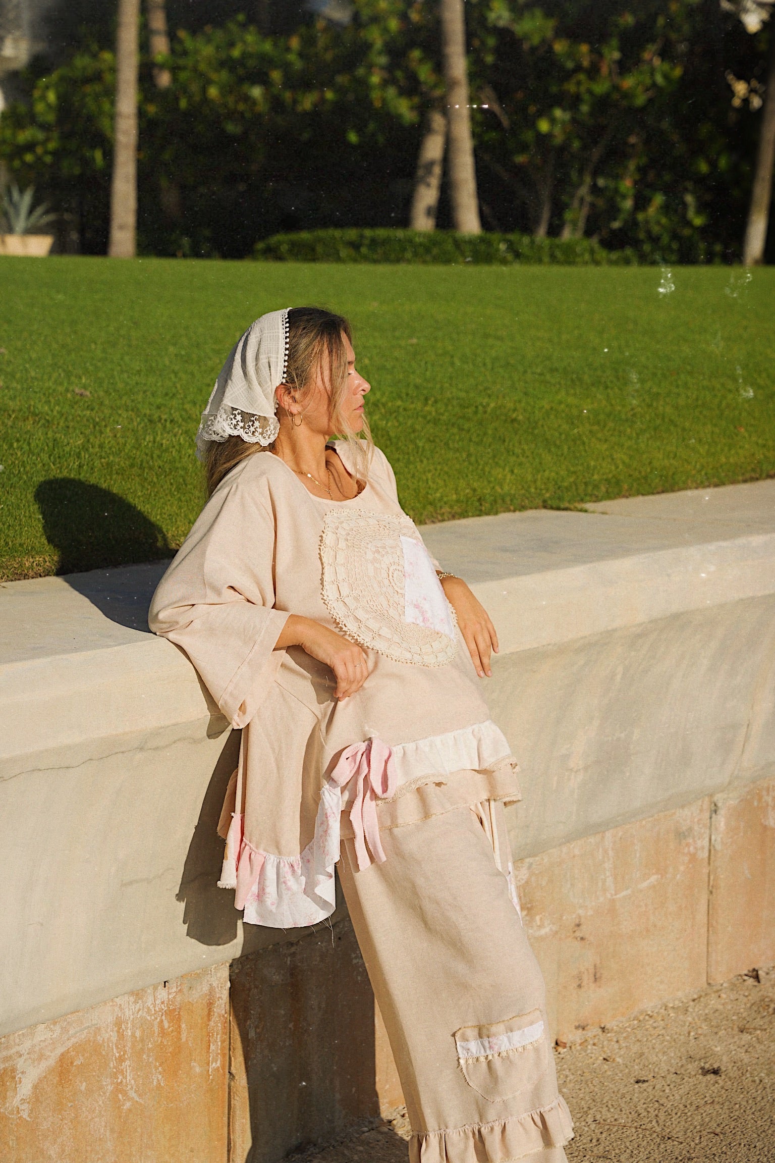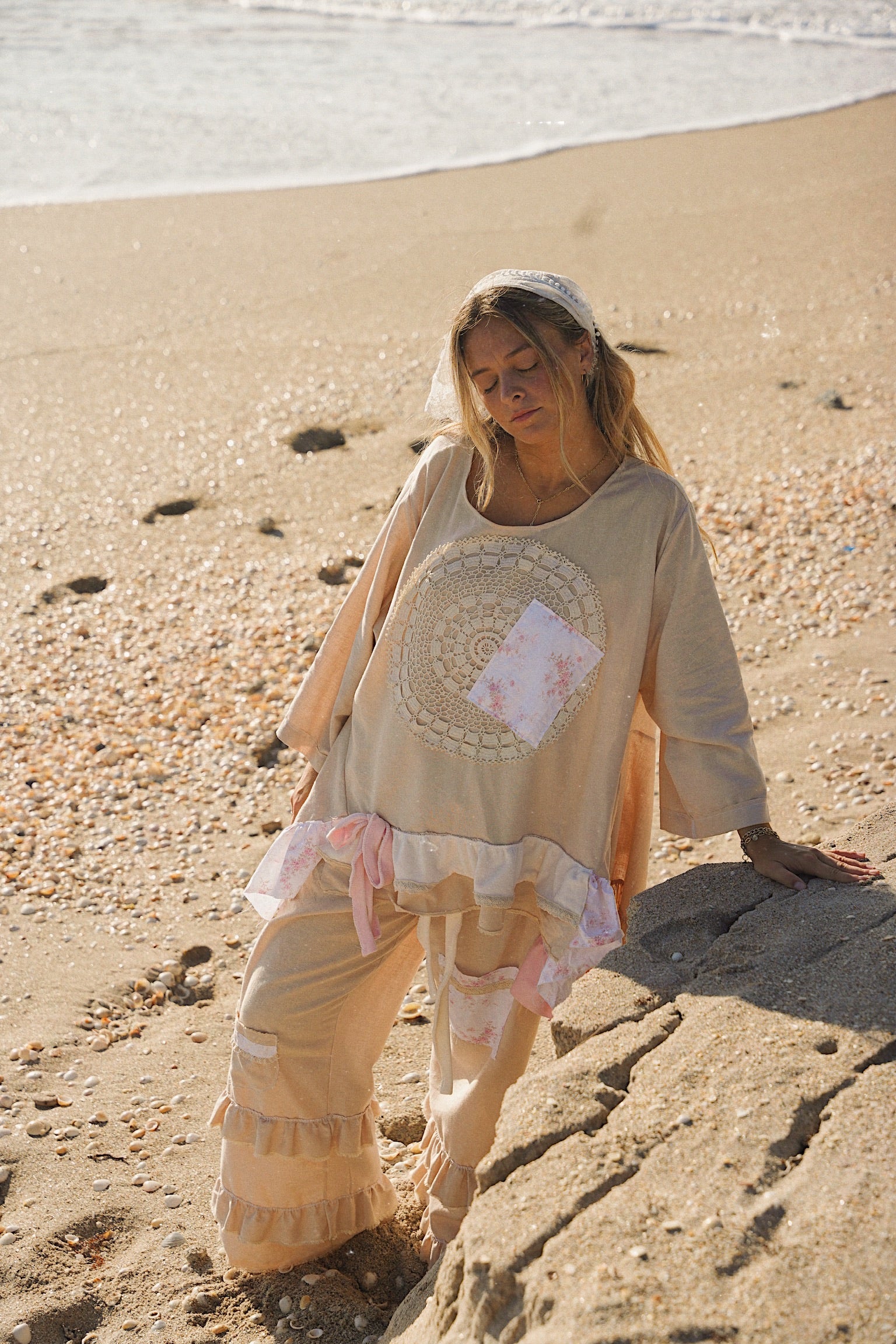 Our Enchanted Top is designed for versatile styling. Perfect for any occasion, it effortlessly channels your vintage bohemian style. Whether worn as a casual dinner top with bloomer pants, as a beach cover-up, or as a dress paired with shorties, this piece is an essential staple for your wardrobe.