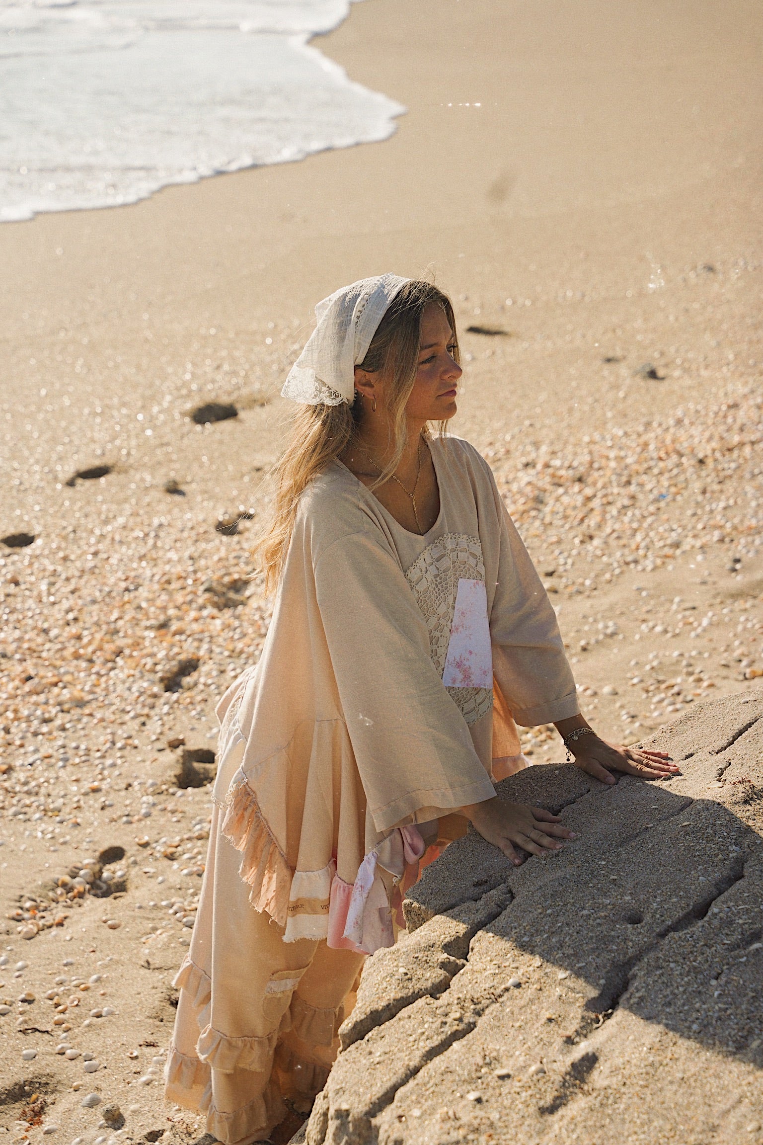 Handmade from a mix of soft beiges, muted florals, vintage cottons, upcycled fabric scraps, and crochet pieces. One size fits all!