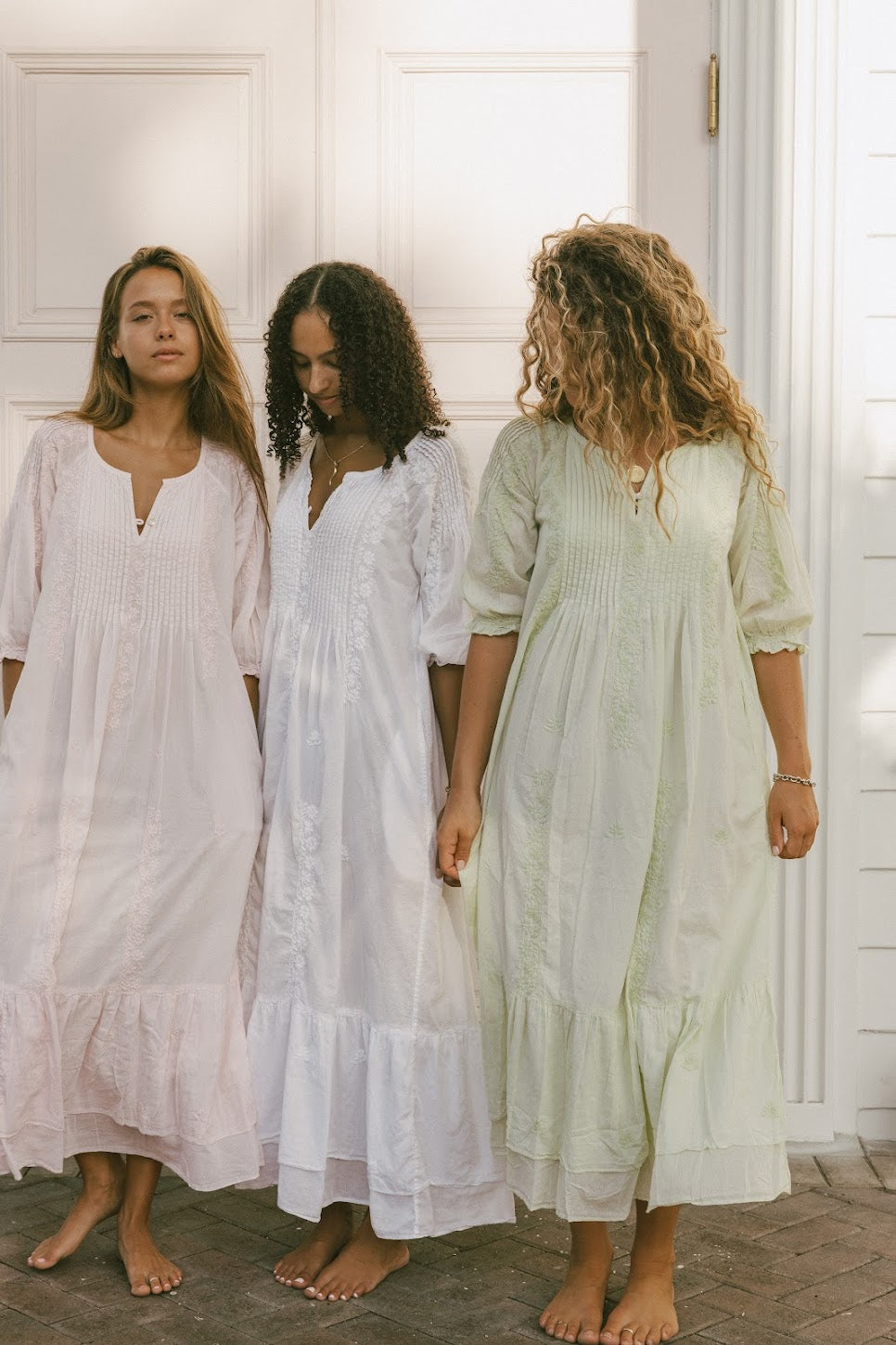 The Keepsake Dress in Ballerina is a timeless maxi crafted from 100% lightweight cotton, designed for effortless wear day after day. Intricate lace detailing, a softly flowing silhouette, and a button-down front bring an air of understated elegance. Mid-length sleeves add a graceful touch, while the slight sheer finish enhances its airy charm. Made to be lived in, this piece blends comfort and beauty, perfect for everything from sunlit mornings to quiet evenings at home.
