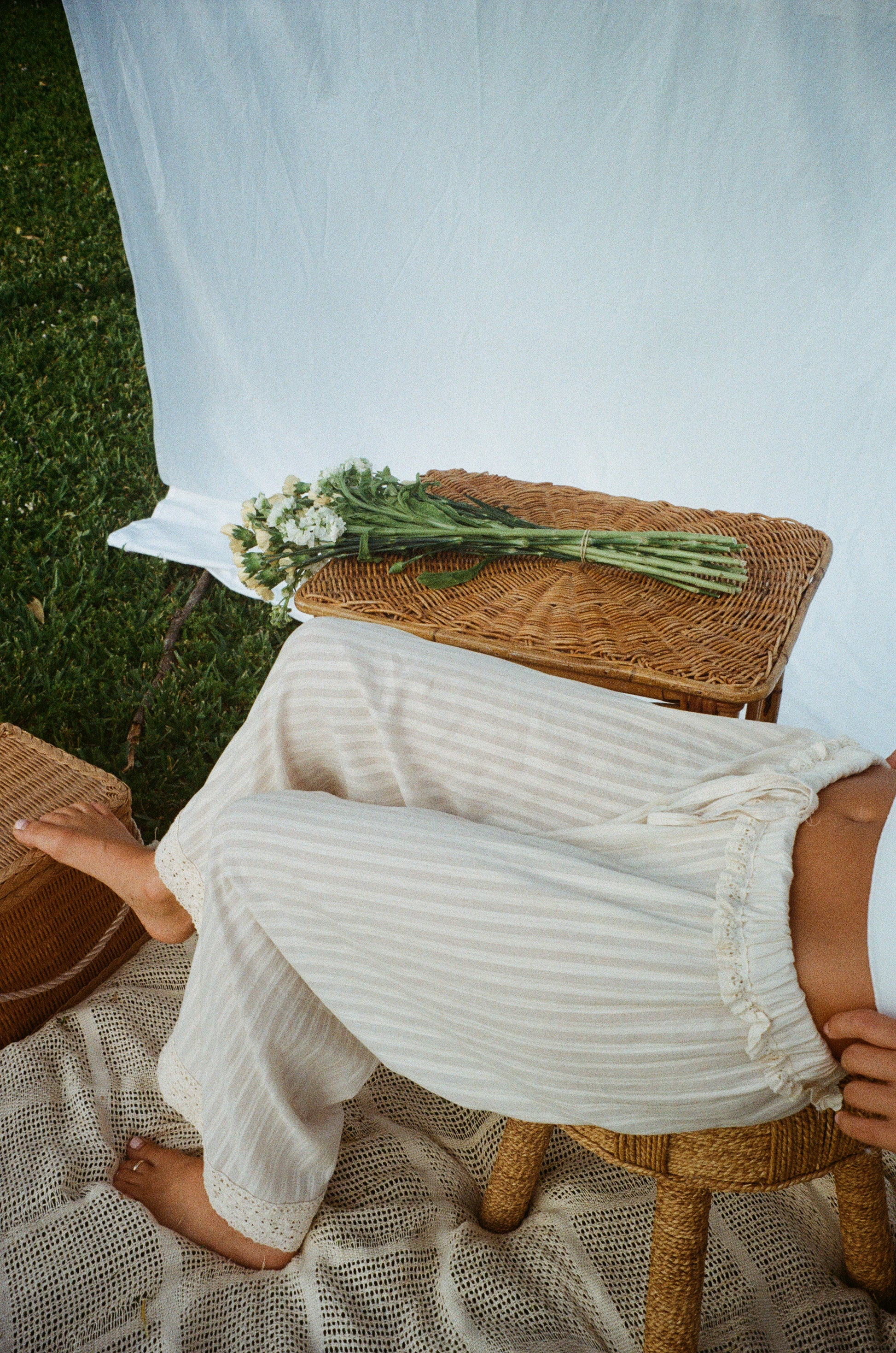Enhance your everyday style with these effortlessly elegant striped pants. Made from a lightweight linen blend in a cream-based fabric, they showcase a subtle translucency that adds to their light and breezy aesthetic. Featuring delicate crochet accents, and an adjustable waist tie for a personalized fit.